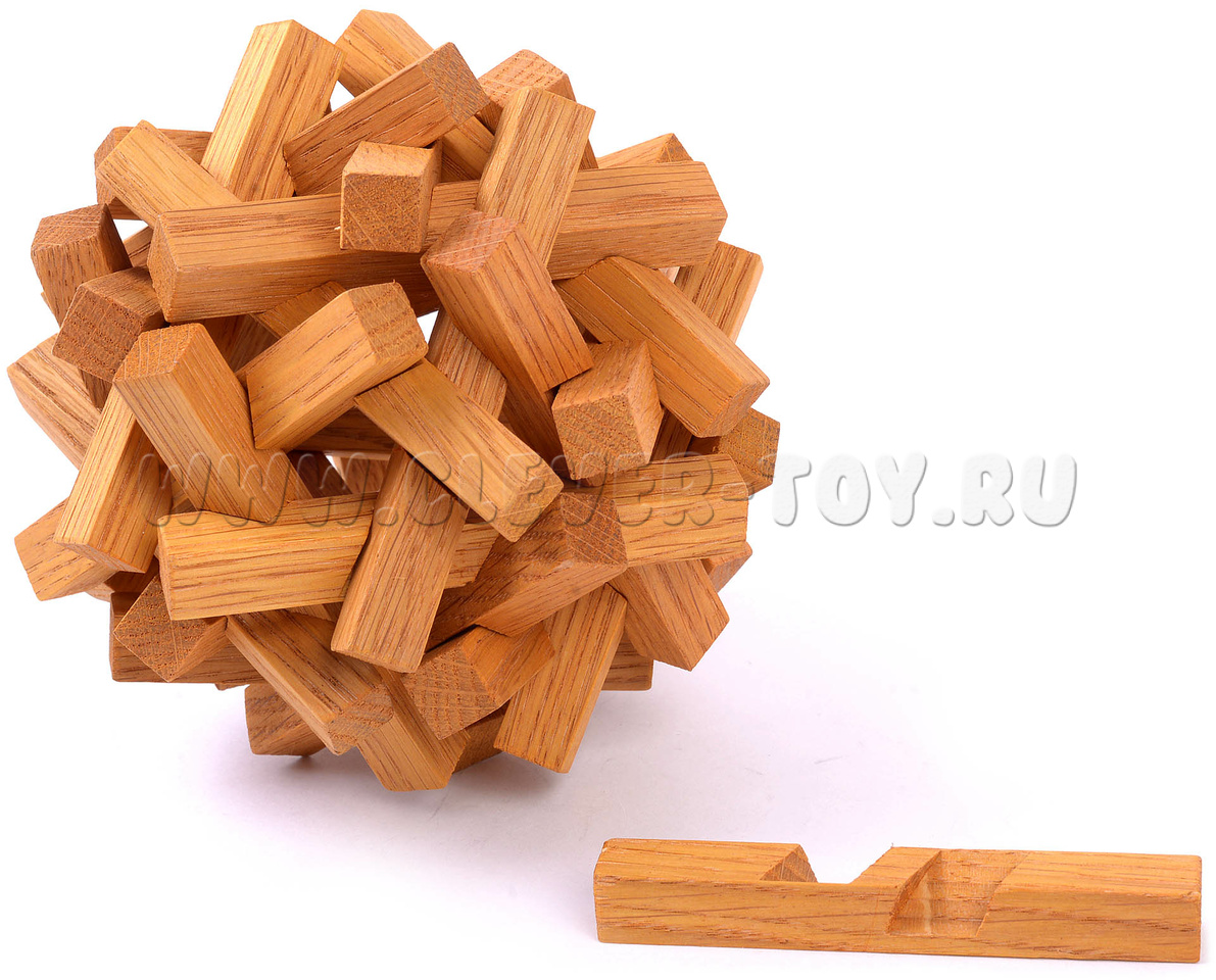Этот деревянный узел состоит из 30 одинаковых брусочков, переплетенных между собой. Узел этот не сложно разобрать, но составить его снова будет не так просто.