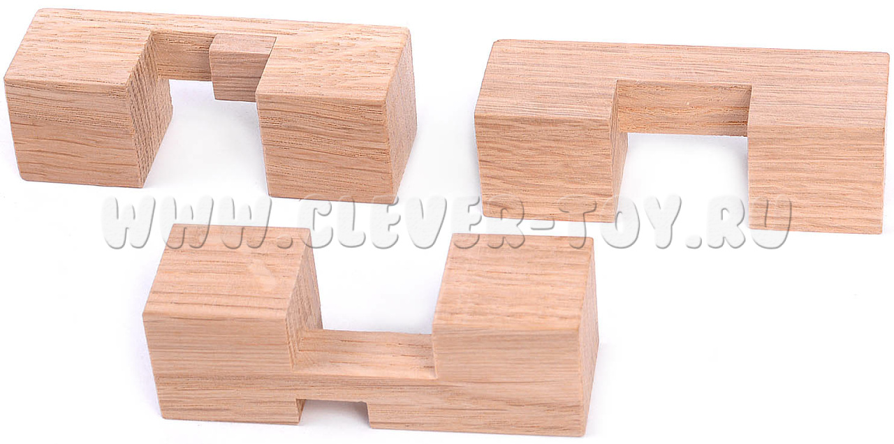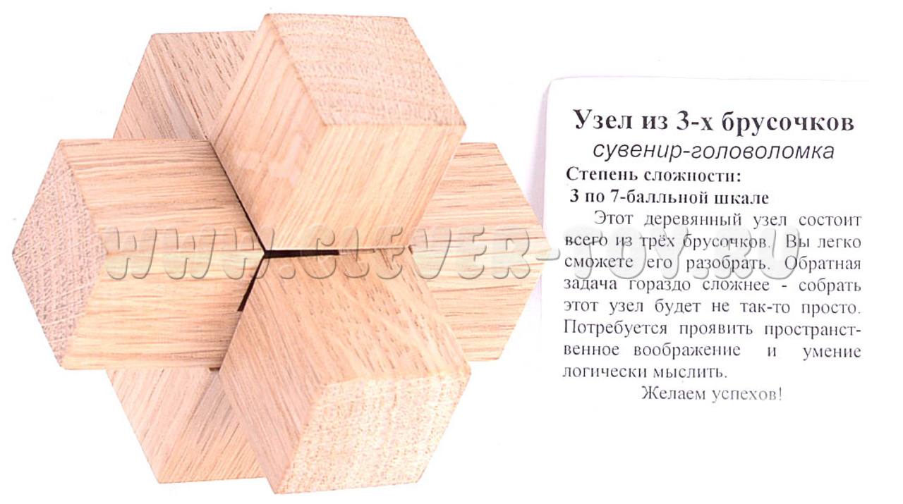 Головоломка “Узел из 3х брусочков” – представитель семейства узловых логических задач. В них основа цель – это разобрать и снова собрать деревянную фигуру. Разобрать данную головоломку будет достаточно простой задачей, но вот сборка уже потребует интеллектуальных раздумий.