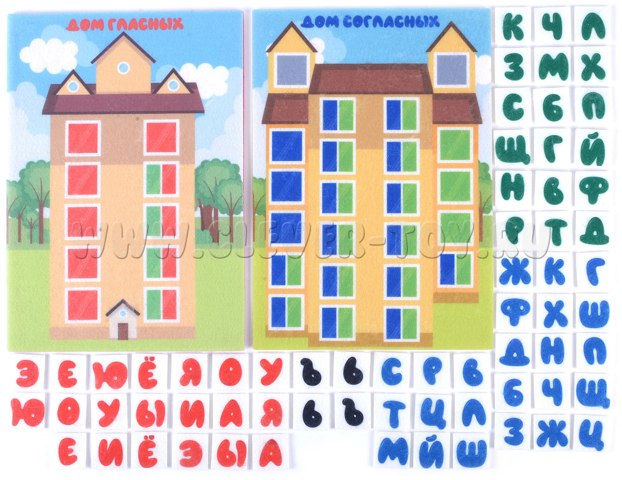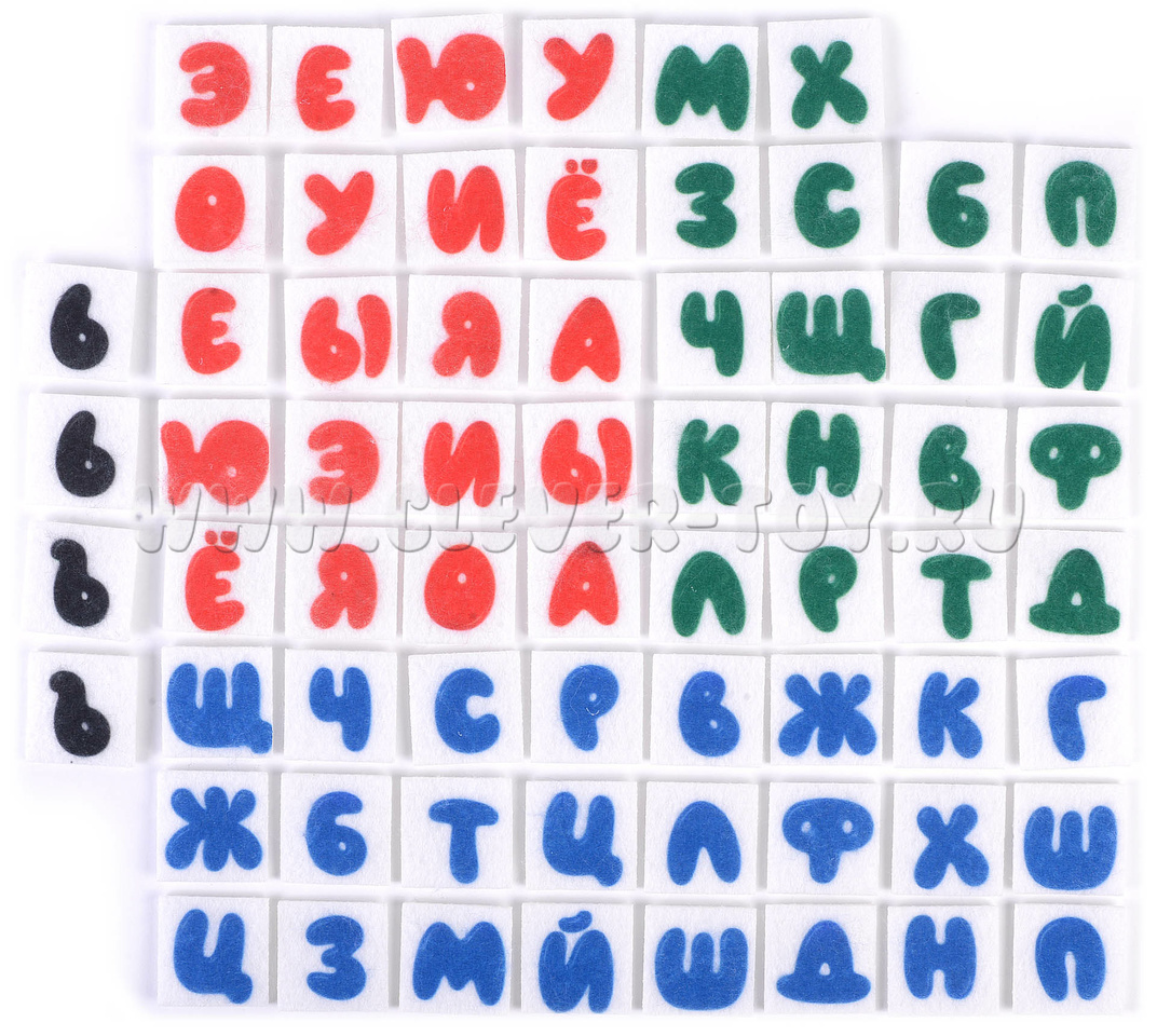 • 66 букв русского алфавита (2 набора гласных – красного цвета, 2 набора согласных – синего и зелёного цвета).