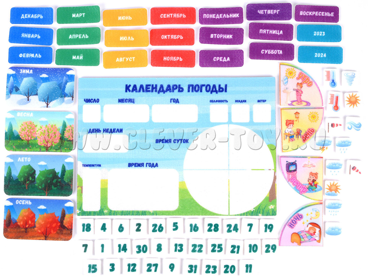 - Таблички, обозначающие времена года (4 шт.), годы (4 шт.), месяца (12 шт.), дни недели (7 шт.), числа (31 шт.), погоду (11 шт.), температуру (2 шт.), время суток (4 шт.).