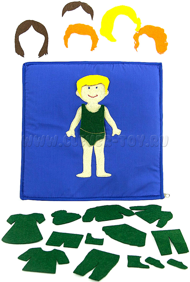 - одежда и обувь (синий, красный, желтый, зеленый) - куртка, теплые штаны, шапочка, пуловер, футболка, шорты, брюки, юбка, платье, трусики с маечкой, туфли, сапоги;