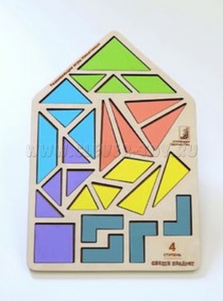 Деревянный планшет - "домик" - это методически правильная упаковка, где фрагменты квадратов хранятся в разобранном виде, что позволяет детям проявлять самостоятельность и творческое мышление.