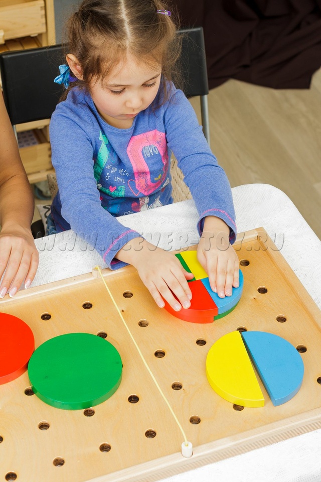 Конструирование в 3D на доске с отверстиями: крепления + цветные верёвочки. Изучение понятий "часть/целое", "треть", "четверть". Развивает пространственное мышление, моторику.