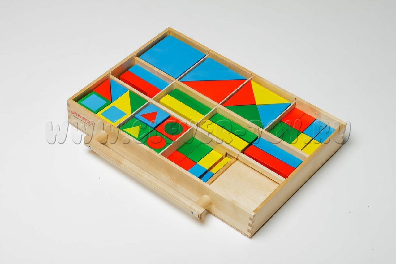 100 фигур (квадраты, треугольники, прямоугольники) 4 цветов и разных размеров. Ребёнок складывает из них другие фигуры и изображения (дома, машины), учится сравнивать, находить общее/различное. Тренирует моторику.