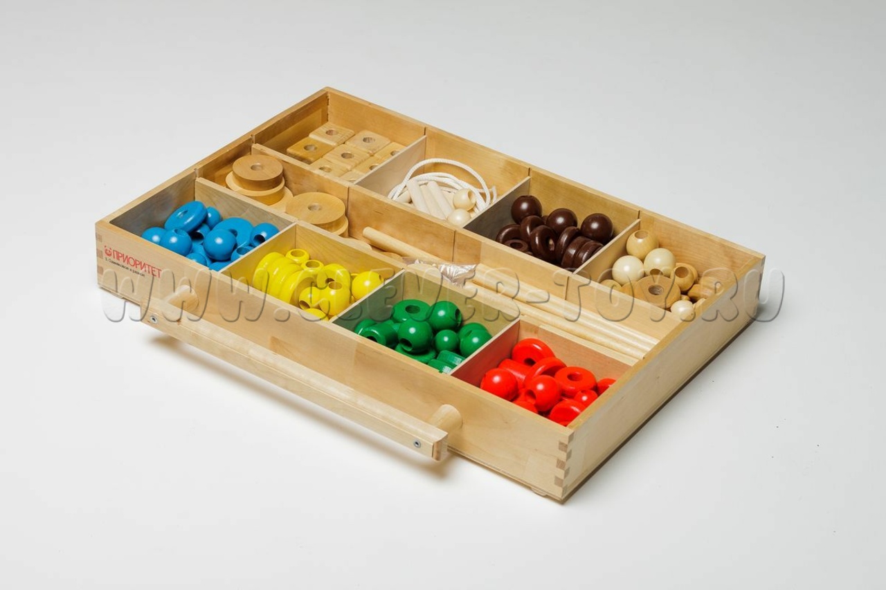 Бусины разной формы с крупными отверстиями, стержни, верёвочки, соединители. Игры: нанизывание по образцу, по цвету/форме, сбор объёмных конструкций. Развивает логику, воображение, наблюдательность.