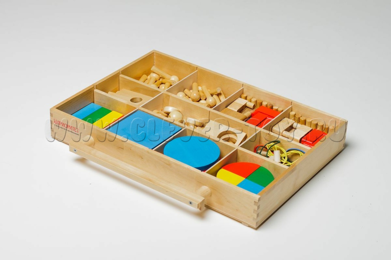 Более 1000 мелких деталей: резиночки, бусины, шнурочки, цилиндрики, набор для завинчивания, игральные кости. На доске с отверстиями ребёнок выкладывает узоры, соединяет элементы, повторяет заданный рисунок. Развивает мелкую моторику и хватательные движения.