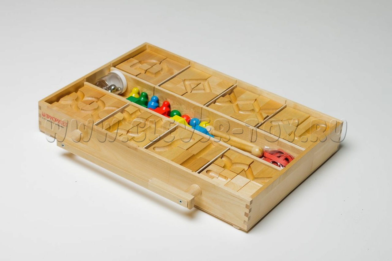 Состав: детали дороги, шарики, толкатели, 4 машинки, 4 фишки.