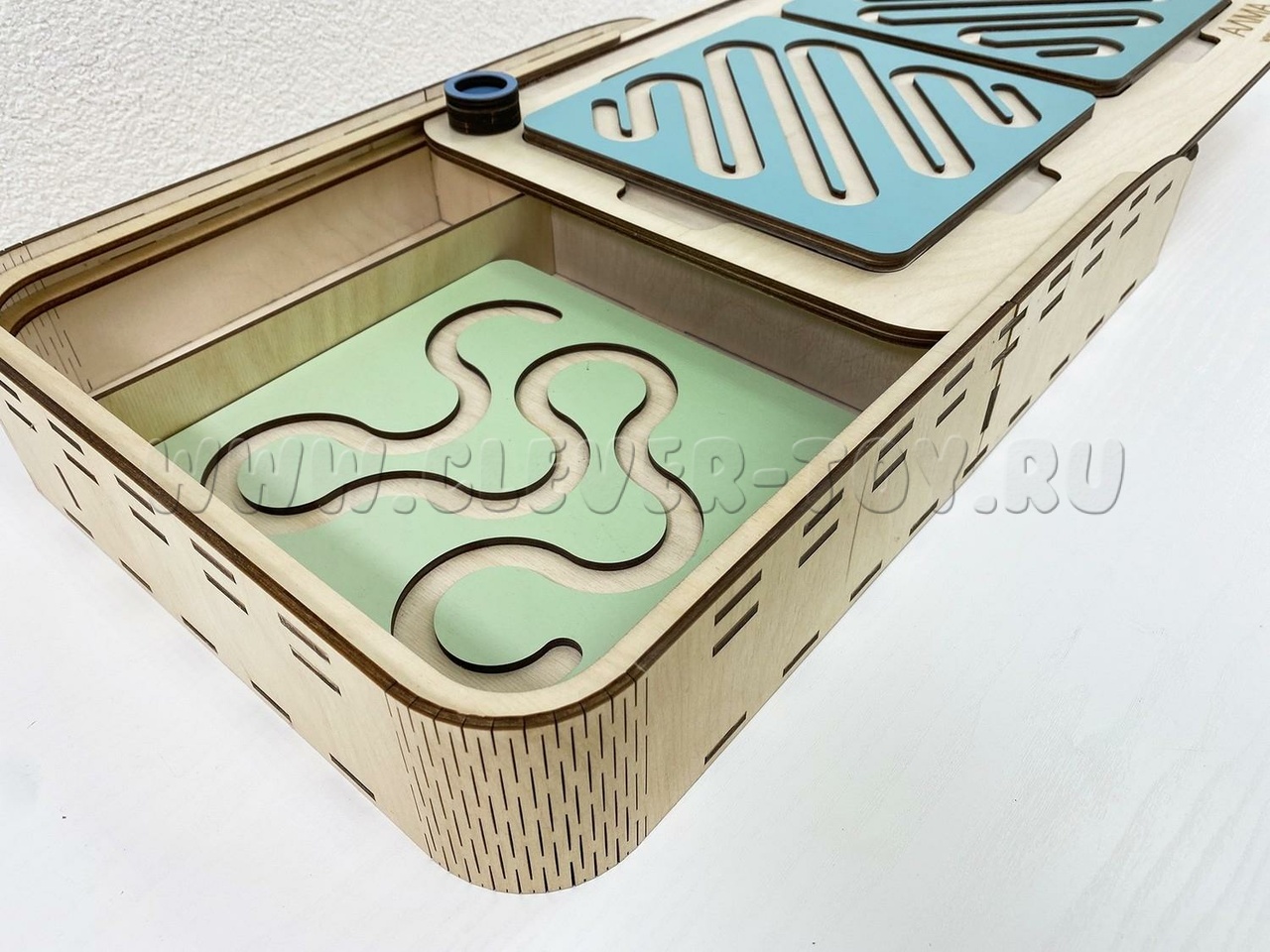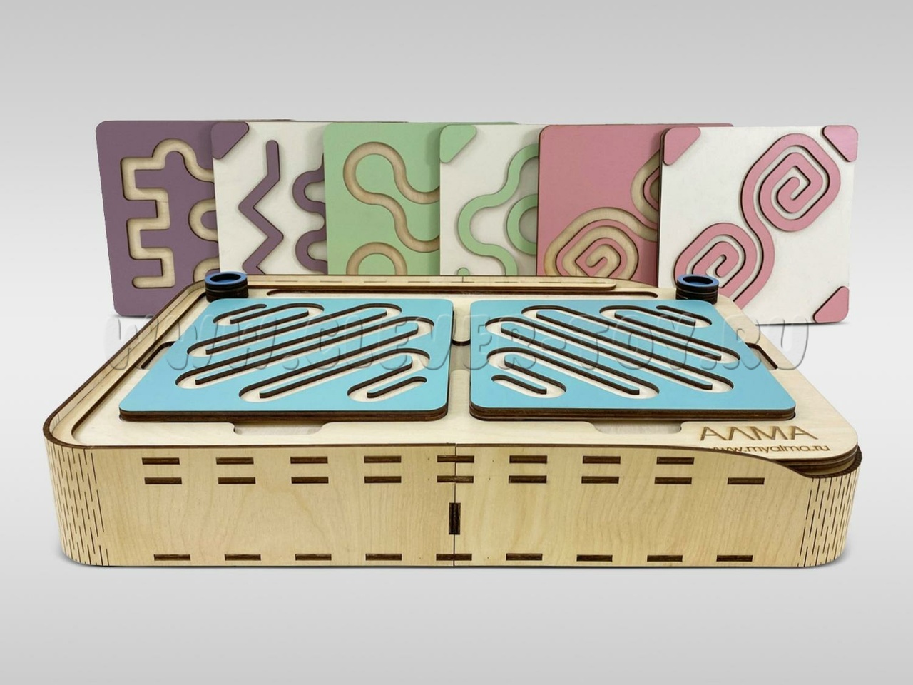 Два лабиринта с изображениями, расположенными симметрично, вставляются в пазы, и ребёнок проходит их с помощью специальных пальчиковых фишек.