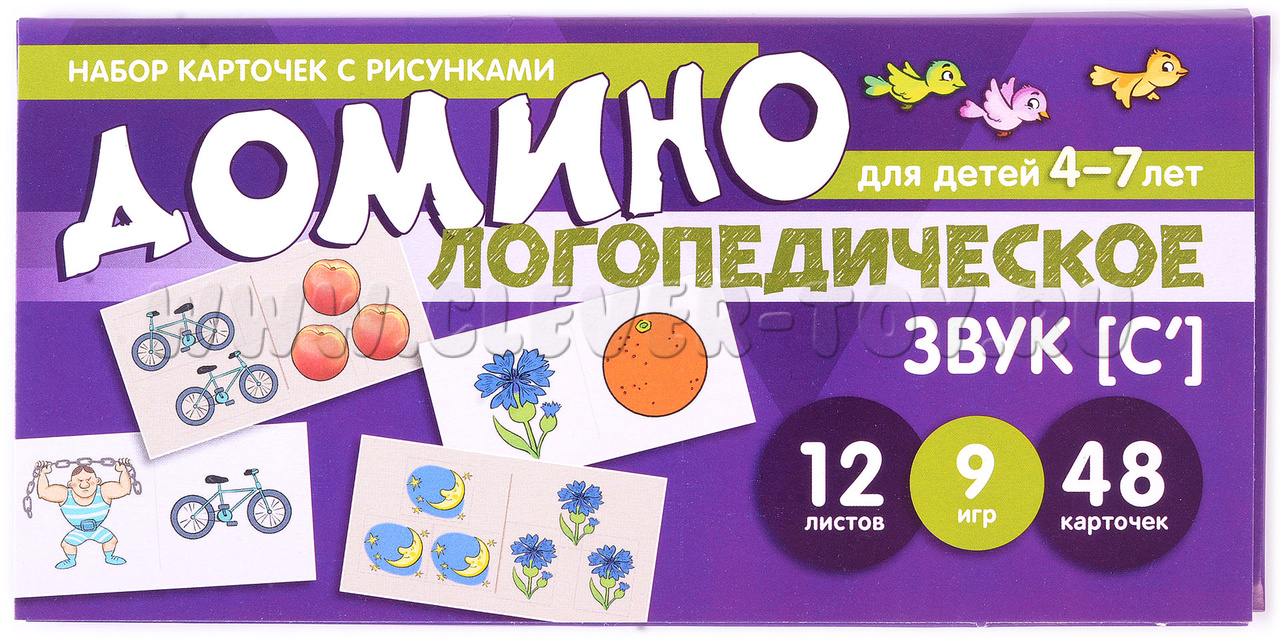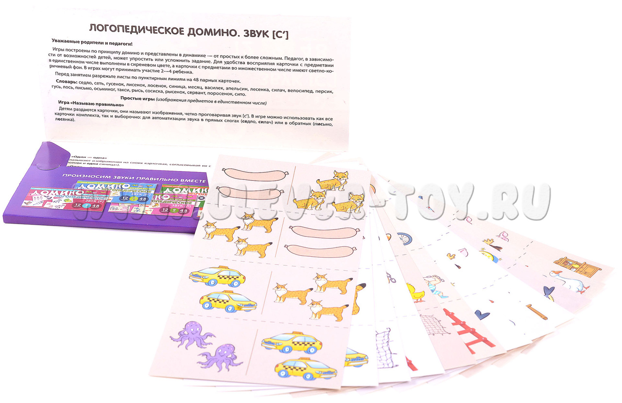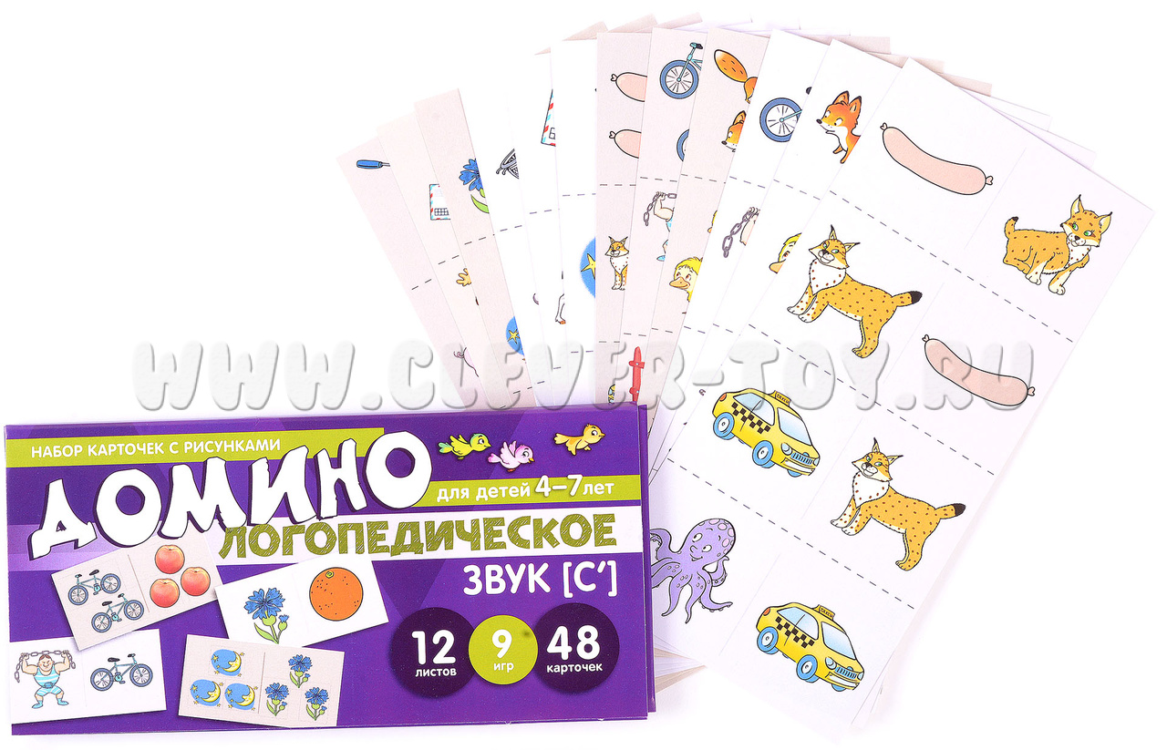 Учебно-игровой комплект "Логопедическое домино" - это набор из 12 обучающих карточек с 48 парными цветными картинками. В процессе игры ребёнок научится правильно произносить свистящий звук [с'], образовывать множественное число существительных и согласовывать их с числительными и прилагательными.
