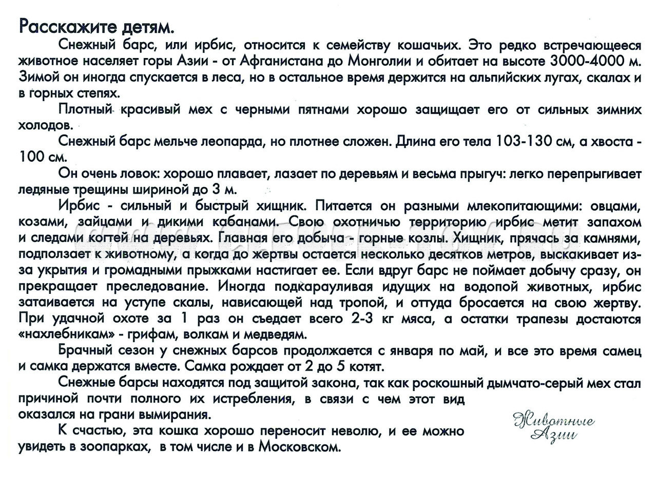 На одной стороне карточки расположена яркая картинка с изображением животного Азии (изображение детальное и реалистичное), на обратной стороне – доступная для ребёнка информация о животных (описывает внешний вид животного, ареал обитания, особенности питания и строения, интересные факты о происхождении животных Азии).