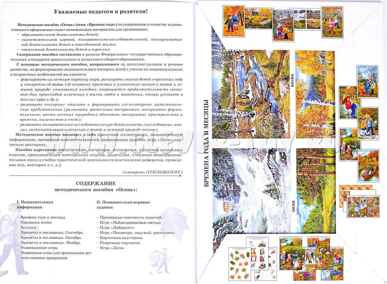 - 10 красочных изображений, иллюстрирующих изменение погоды, явления природы, виды деятельности, на обороте - список признаков осени, пословицы и приметы, загадки, планы развивающих и подвижных игр;