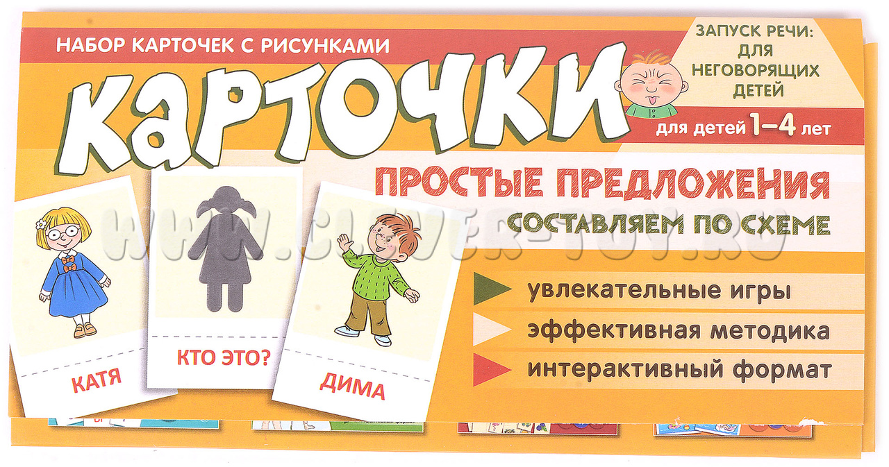 Набор "Простые предложения. Составляем по схеме" включает в себя 12 страниц с 72 карточками и 4 игры. Он предназначен для детей в возрасте от 1 года до 4 лет.