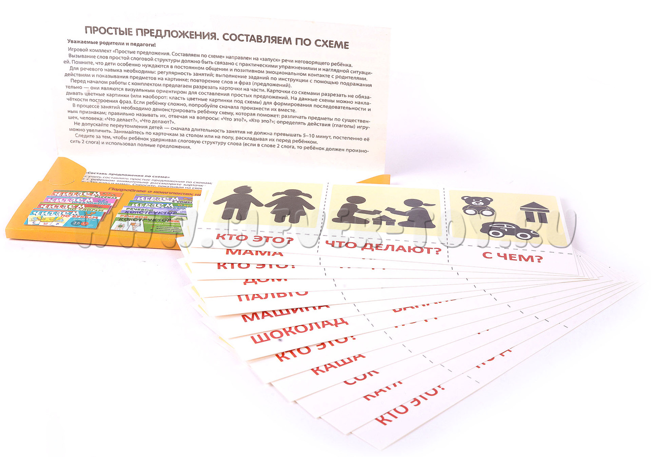 Задания в наборе представлены в игровой форме и помогают стимулировать речь у неговорящих детей, делая первые шаги к составлению простых предложений по схеме.