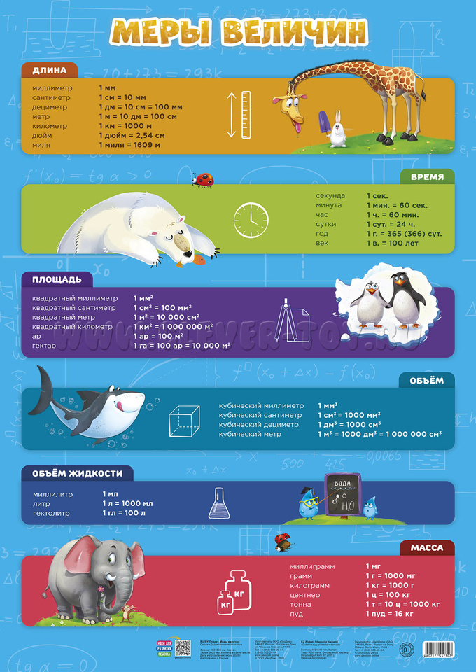 Комплектация: обучающий плакат "Меры величин" (45*64 см), обучающий плакат "Части речи" (45*64 см), обучающий плакат "Падежи и склонения" (45*64 см).