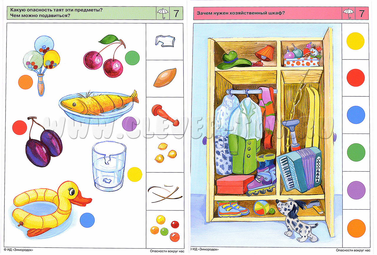 Задания комплекта направлены на обучение ребёнка предвосхищать (предупреждать) опасные ситуации и закреплять алгоритм действий, если все-таки произошёл несчастный случай или происшествие. В процессе решения заданий комплекта дети научатся анализировать возможную опасность, которую могут таить в себе повседневные, с виду безобидные предметы, или ситуации которые могут привести к нежелательным и опасным последствиям. Примеры заданий в карточках: 1б. Какие опасности подстерегают малыша в этой комнате? 2а. Окажи первую помощь. 2б. Предупреди бабушку с дедушкой об опасности. 4б. Что случилось в этой комнате? 7а. Какую опасность таят эти предметы?