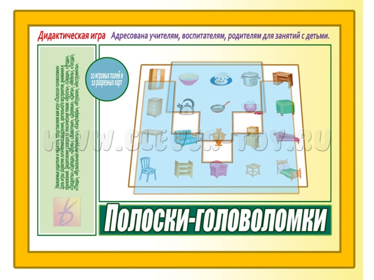 1. Развить логическое мышление. Игра представляет собой набор непрозрачных полосок разной формы, которые нужно определенным образом (см. задания на обороте папки) расположить на листе так, чтобы закрыть/оставить открытыми только конкретные изображения. Ребенок будет тренировать навыки анализа, сравнения, классификации, мышление в двумерном пространстве – основу для развития пространственного объемного мышления;