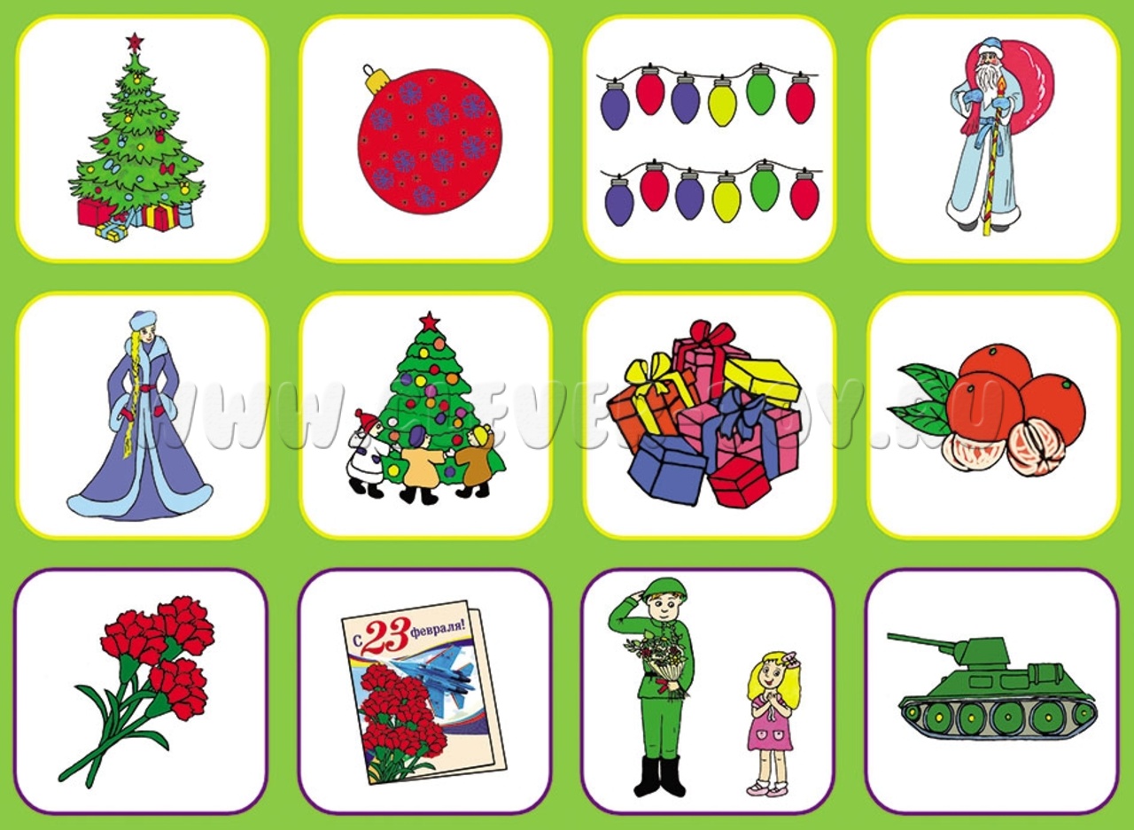 1. Выложите перед ребенком пустое игровое поле и стопку карточек. Предложите малышу назвать праздник, который он видит в центре игрового поля, рассказать, в какое время года его празднуют, что ребенок о нем знает. После предложите малышу подобрать к празднику карточки с картинками, которые ассоциируются с этим праздником;