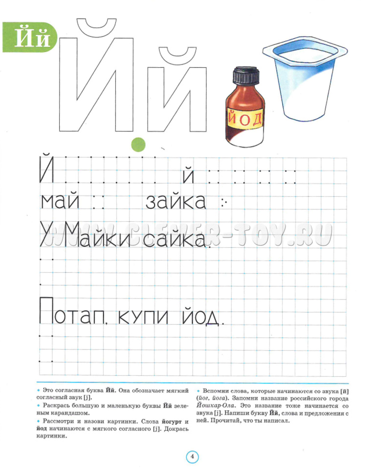 Тетрадь познакомит малышей со звуками, их местом в слове, поможет развить мелкую моторику и освоить начертание основных элементов, входящих в состав букв, букв по отдельности и в составе слова, поспособствует привыканию к тетрадной разметке в клетку.