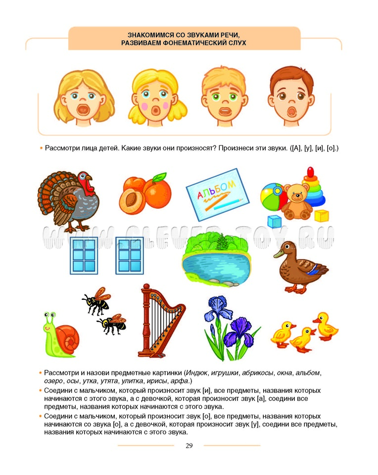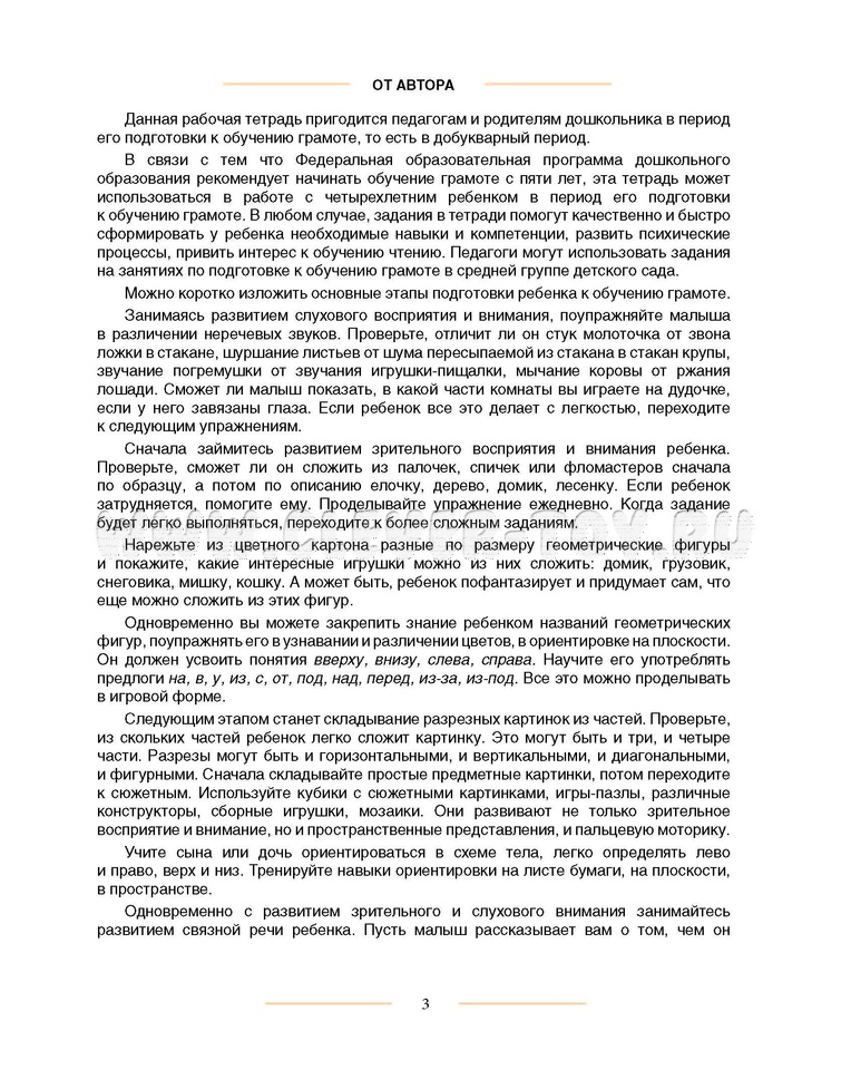 Родители и педагоги получают материал для развития у детей слухового и зрительного внимания, навыков ориентировки в схеме собственного тела, в пространстве, на плоскости, конструктивных навыков, связной речи, навыков слогового анализа слова и анализа предложений.