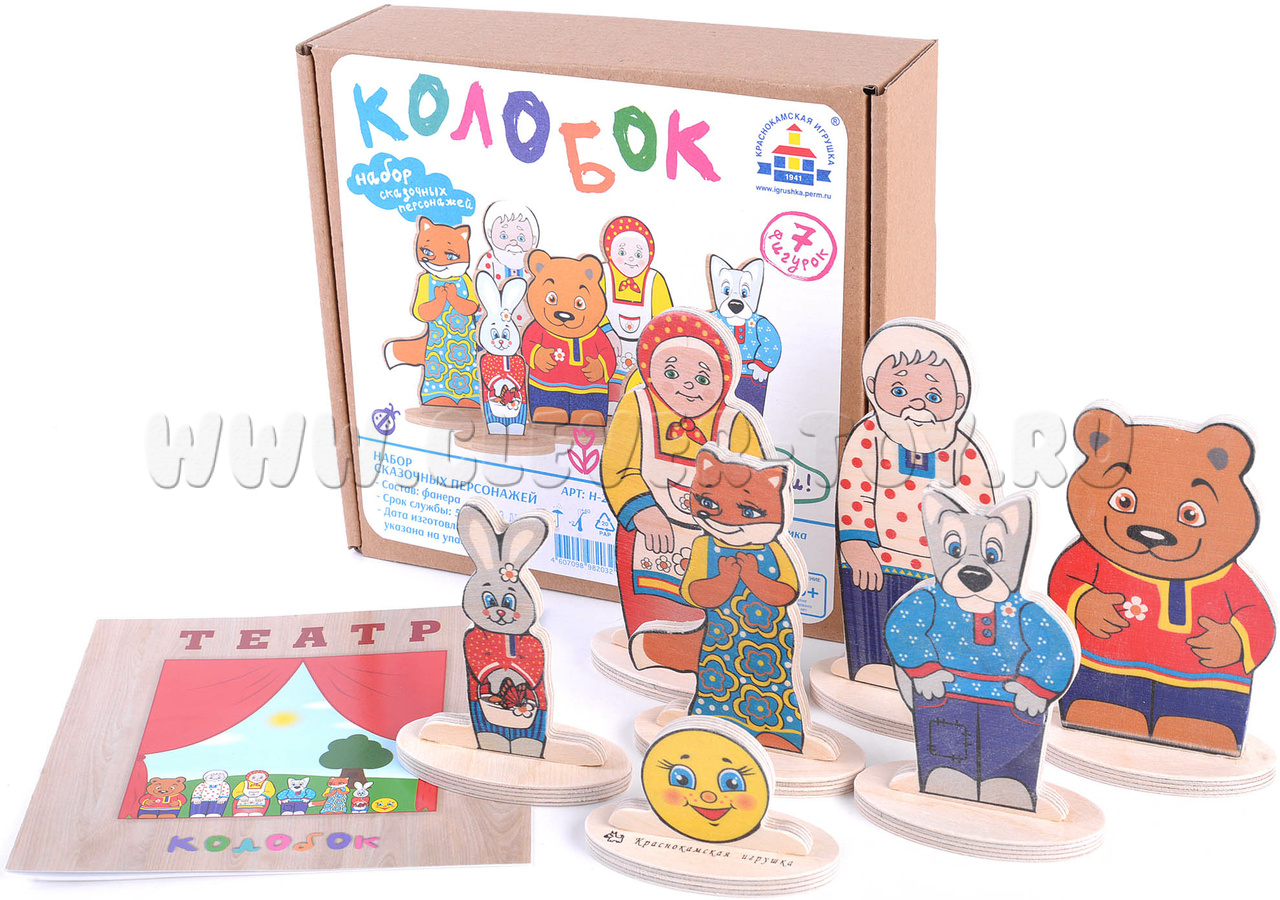 - 7 деревянных фигурок на подставках (Колобок, Дед, Бабка, заяц, медведь, волк, лиса) размером от 4 до 12 см.