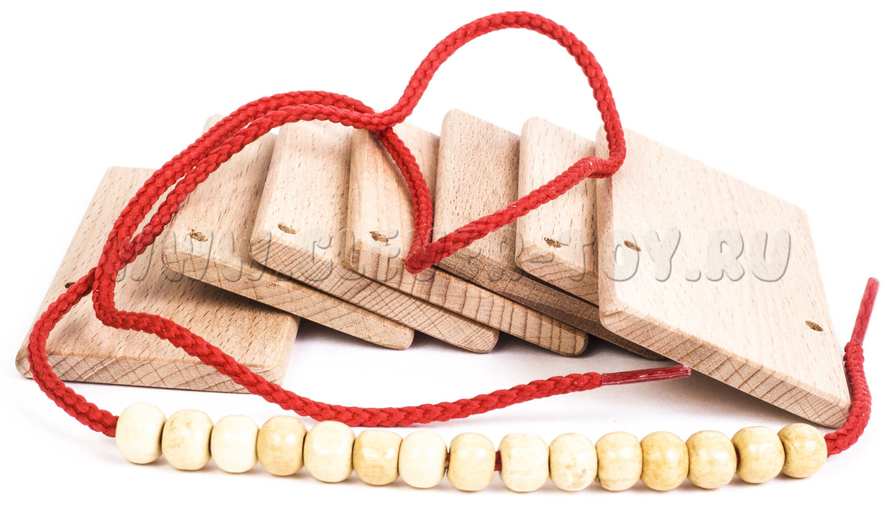 - Пластичная трещотка- сувенирная, состоит из 7 пластин, которые скреплены между собой через деревянные бусинки шнуром.