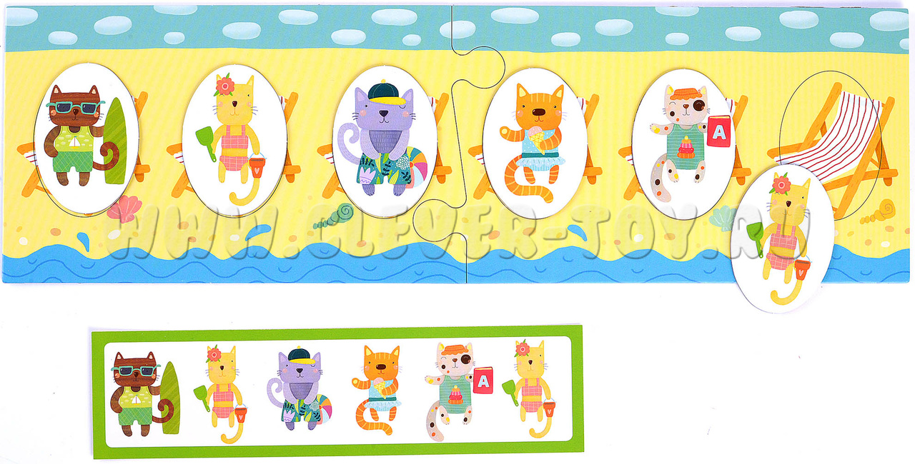 - Игра для поля с шезлонгами (обратная сторона игрового поля). Начинайте с заданий в зеленой рамке: воспроизводите заданную карточкой последовательность котят. Более сложные задания предлагают не только продолжить ряд, но и установить взаимосвязь и закончить последовательность самостоятельно. К этим заданиям стоит переходить, когда малыш уверенно справляется с зелеными карточками.