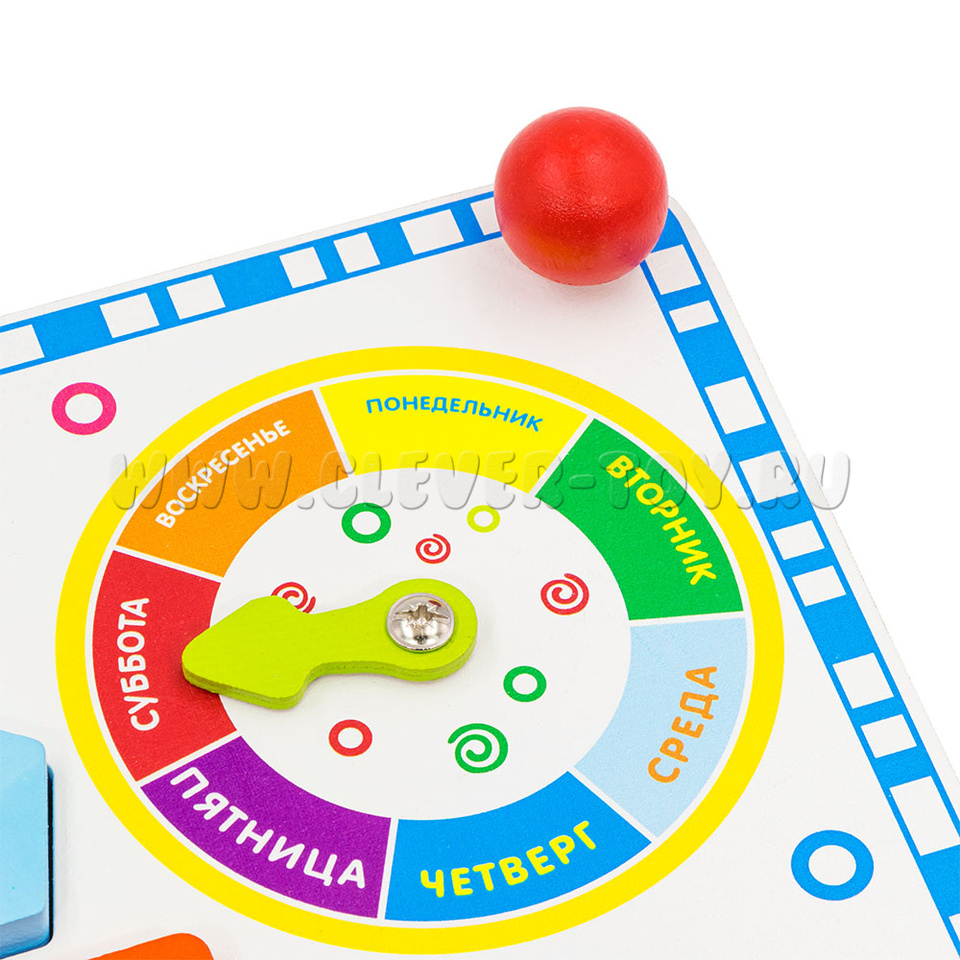 Внешний круг – с цифрами от 1 до 12 –обозначает часы, внутренний круг - с цифрами 5,10,15,20,25,30,35,40,45,50,55,60 – обучит ребёнка обозначению минут в часе. Также познакомит с секундами. В центре круга – вращающиеся стрелки (синяя маленькая – часовая, большая красная – минутная и секундная). - Сектор «Дни недели».