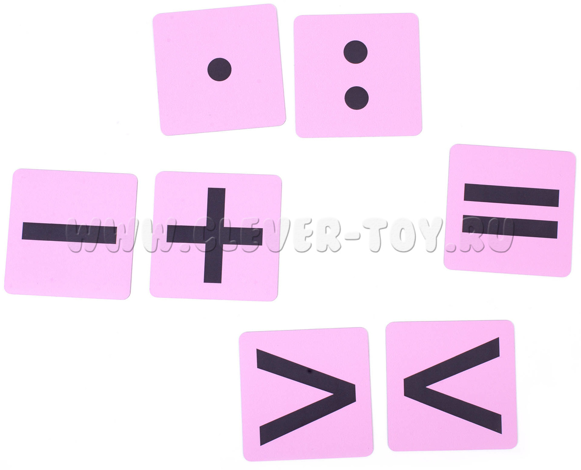 • Знаки действий +, -, X, : = и символы <, > (по одной карточке).