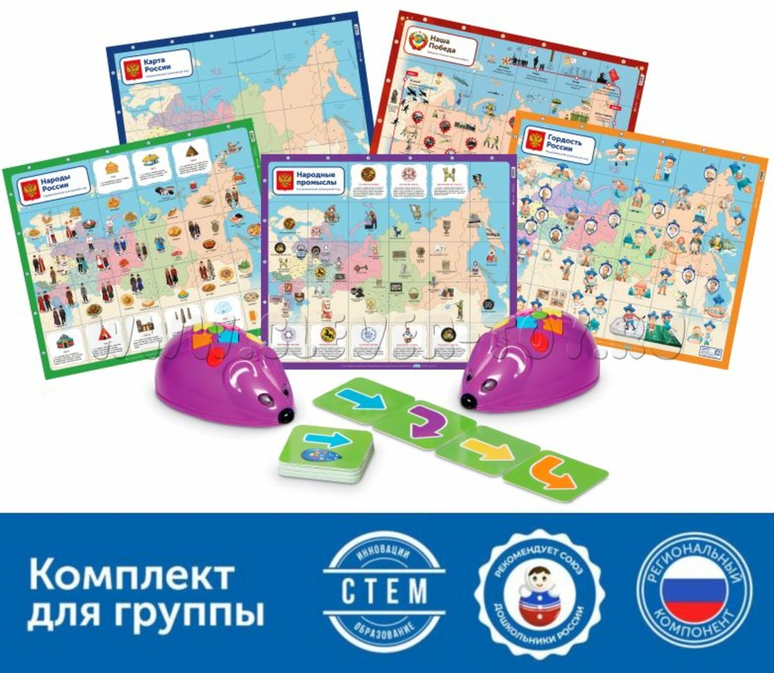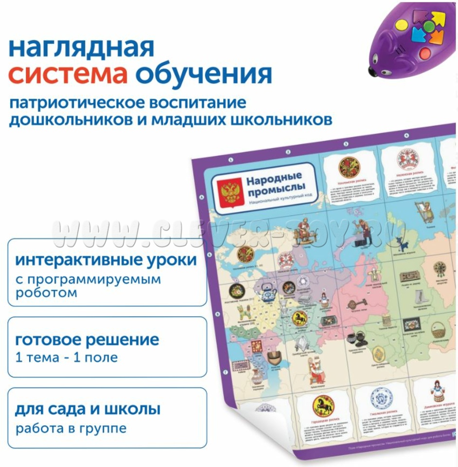 Комплект "Национальный культурный код" с РобоМышью представляет собой интерактивный инструмент для детского сада, который знакомит детей с культурой России через игру и развивает ключевые навыки дошкольников.