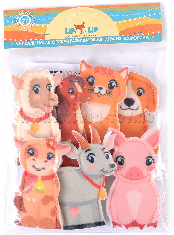 Набор пальчикового театра состоит из: 7 фигурок (размер: 9 см) с изображением домашних животных (собака, лошадь, кот, свинья, коза, овца, корова) и инструкции с описанием игр.